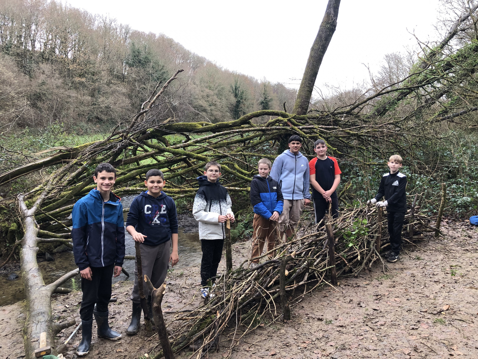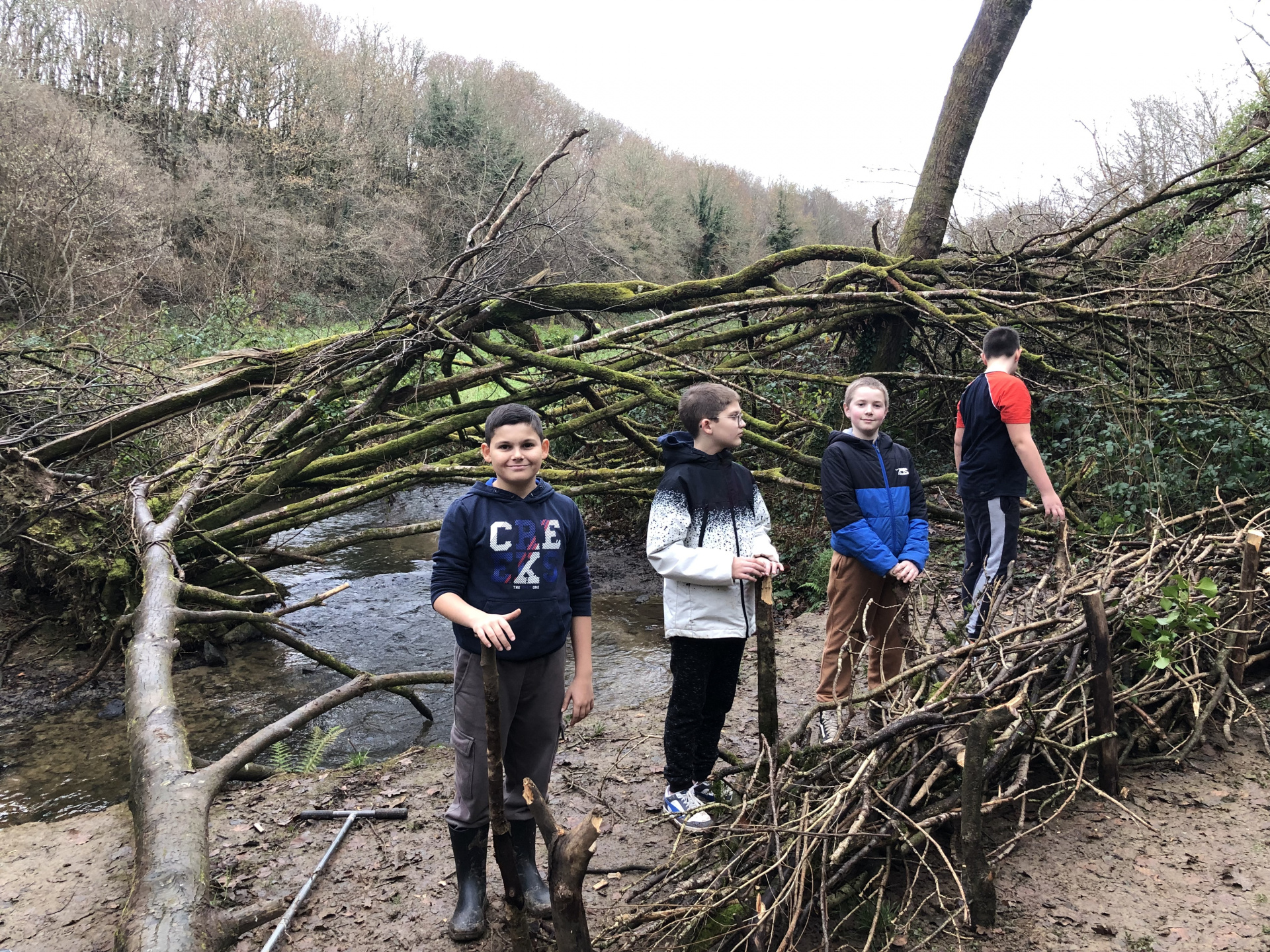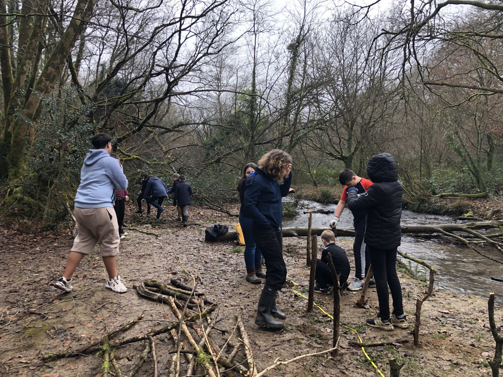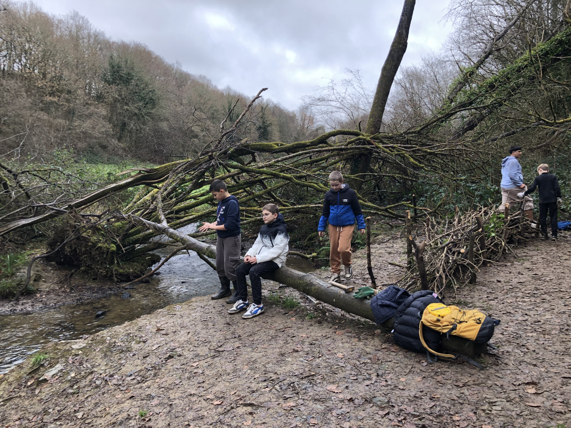 Avec Maëla Péron de l’EPAGA, une expérience a été tentée : installer deux haies sèches pour limiter l’écoulement de la boue dans la rivière, procurer un abri pour de multiples espèces animales et créer une zone de non-piétinement. Les élèves ont donc utilisé les branchages trouvés au sol autour de la berge, quelques outils et beaucoup d’énergie…et en deux heures, deux belles haies sèches avaient fait leur apparition :-)