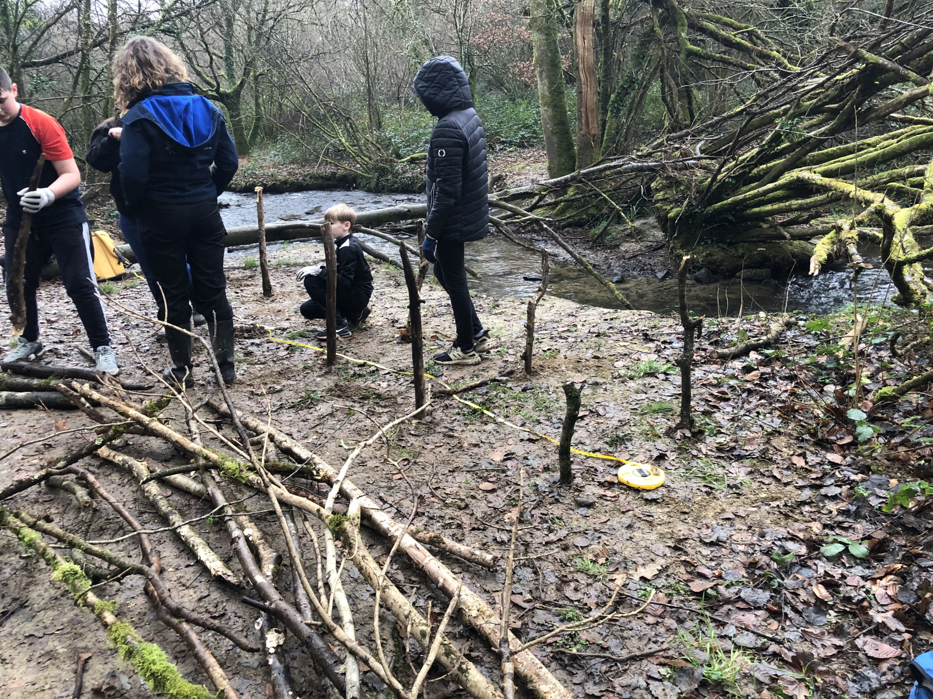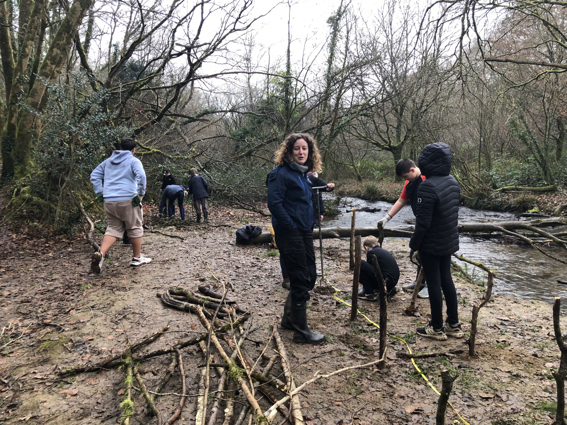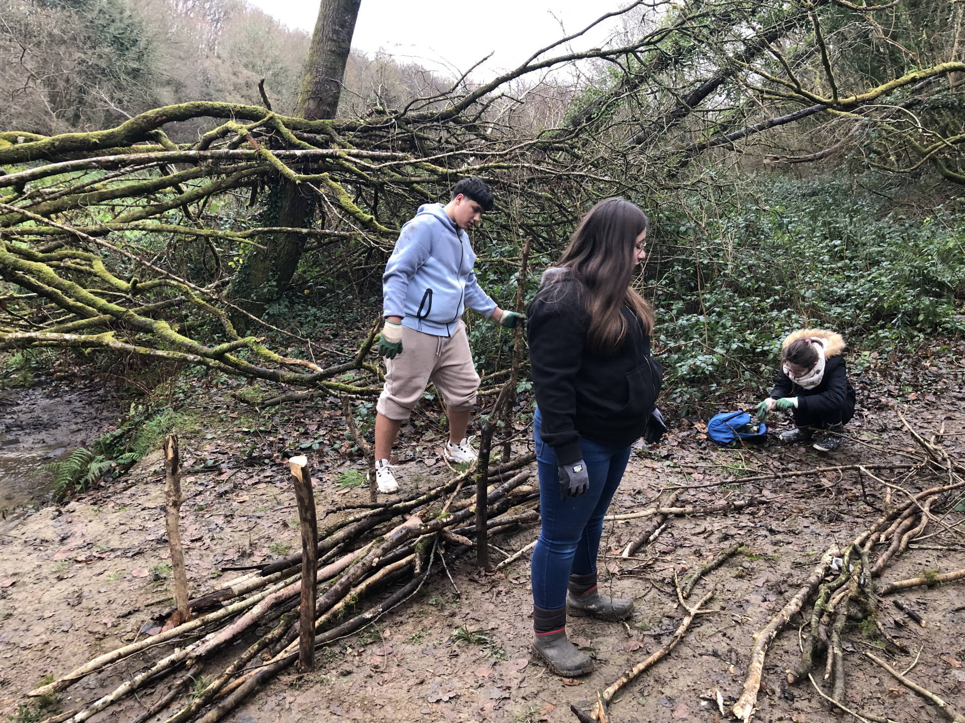 Avec Maëla Péron de l’EPAGA, une expérience a été tentée : installer deux haies sèches pour limiter l’écoulement de la boue dans la rivière, procurer un abri pour de multiples espèces animales et créer une zone de non-piétinement. Les élèves ont donc utilisé les branchages trouvés au sol autour de la berge, quelques outils et beaucoup d’énergie…et en deux heures, deux belles haies sèches avaient fait leur apparition :-)