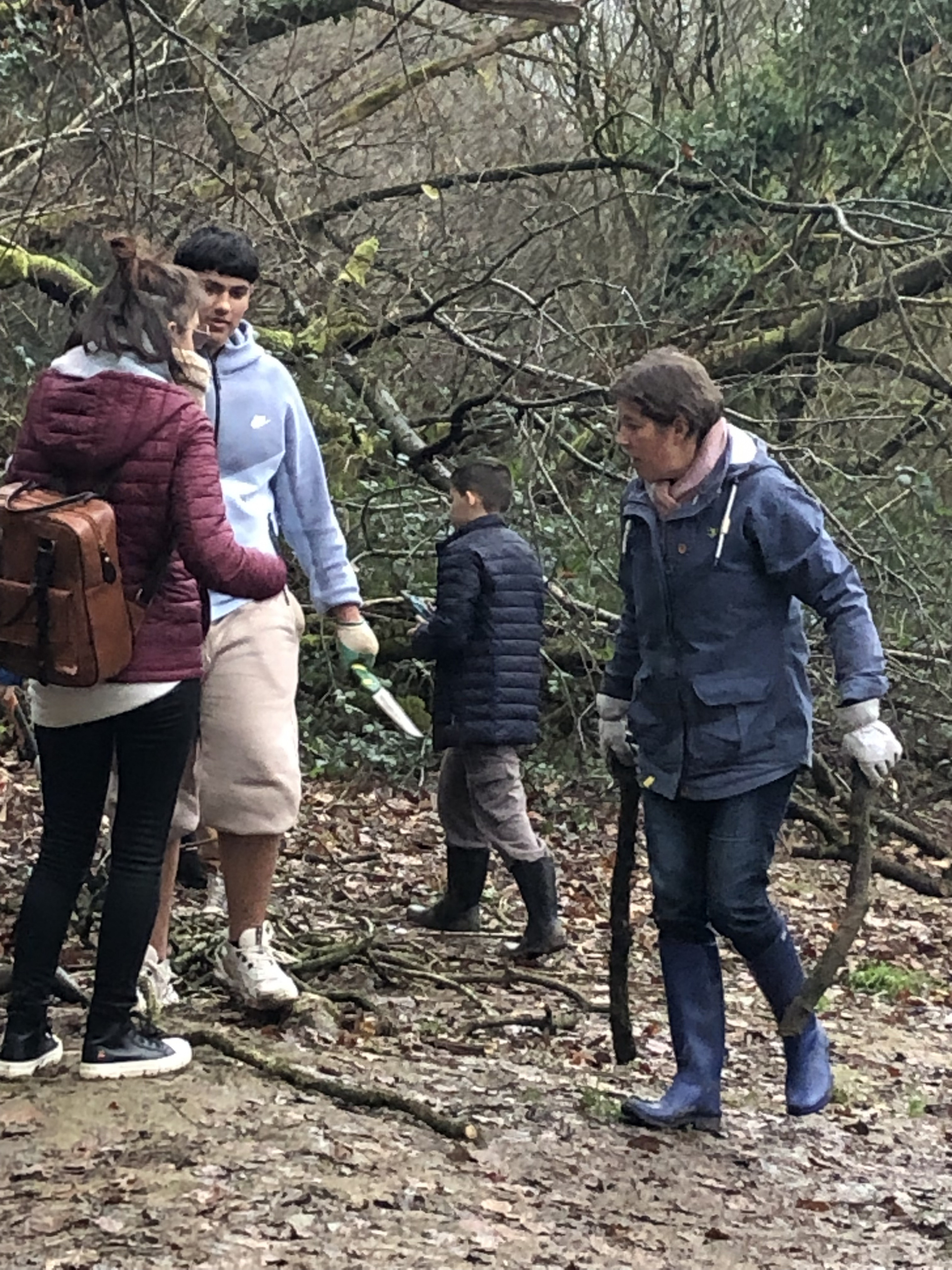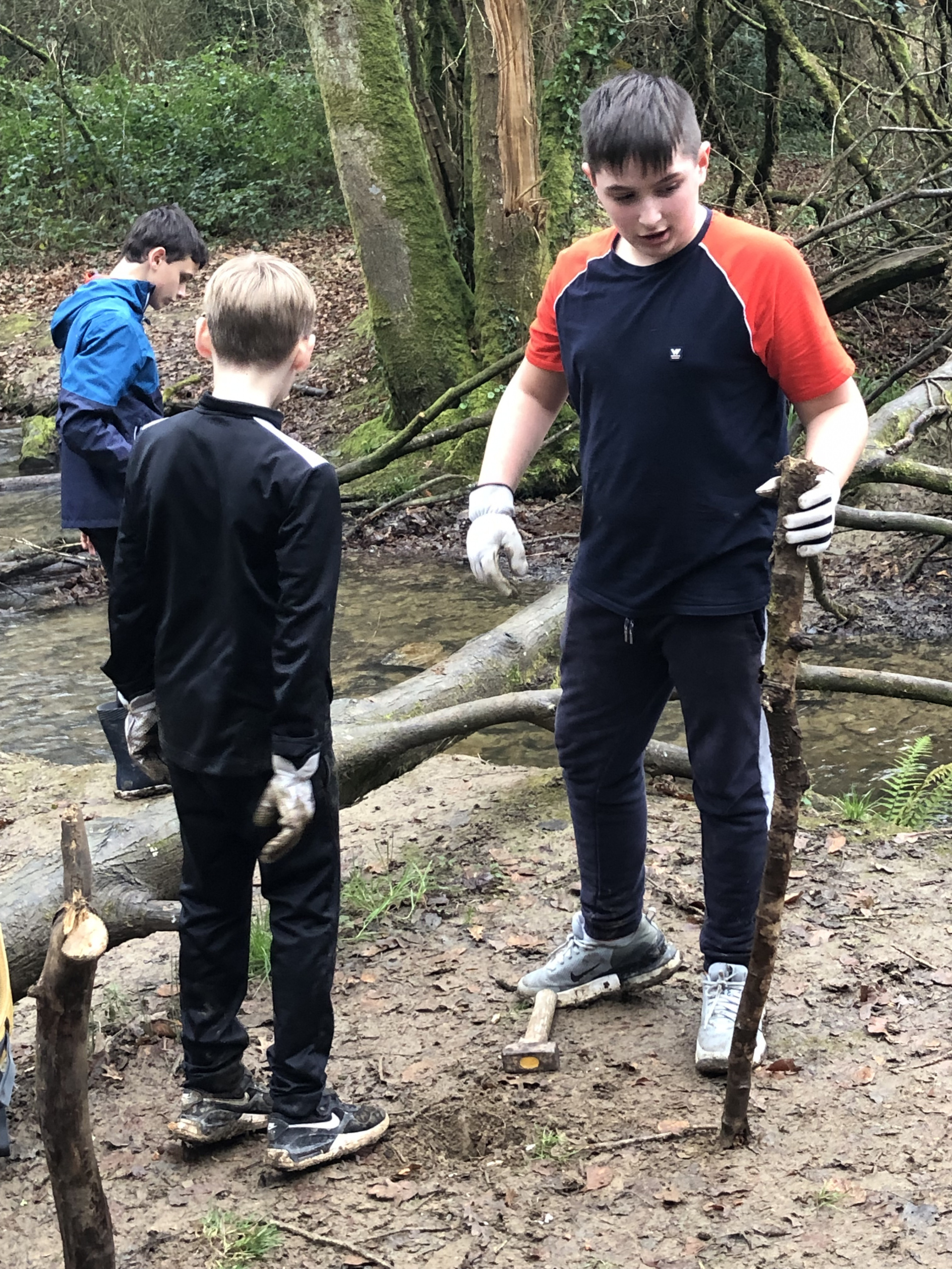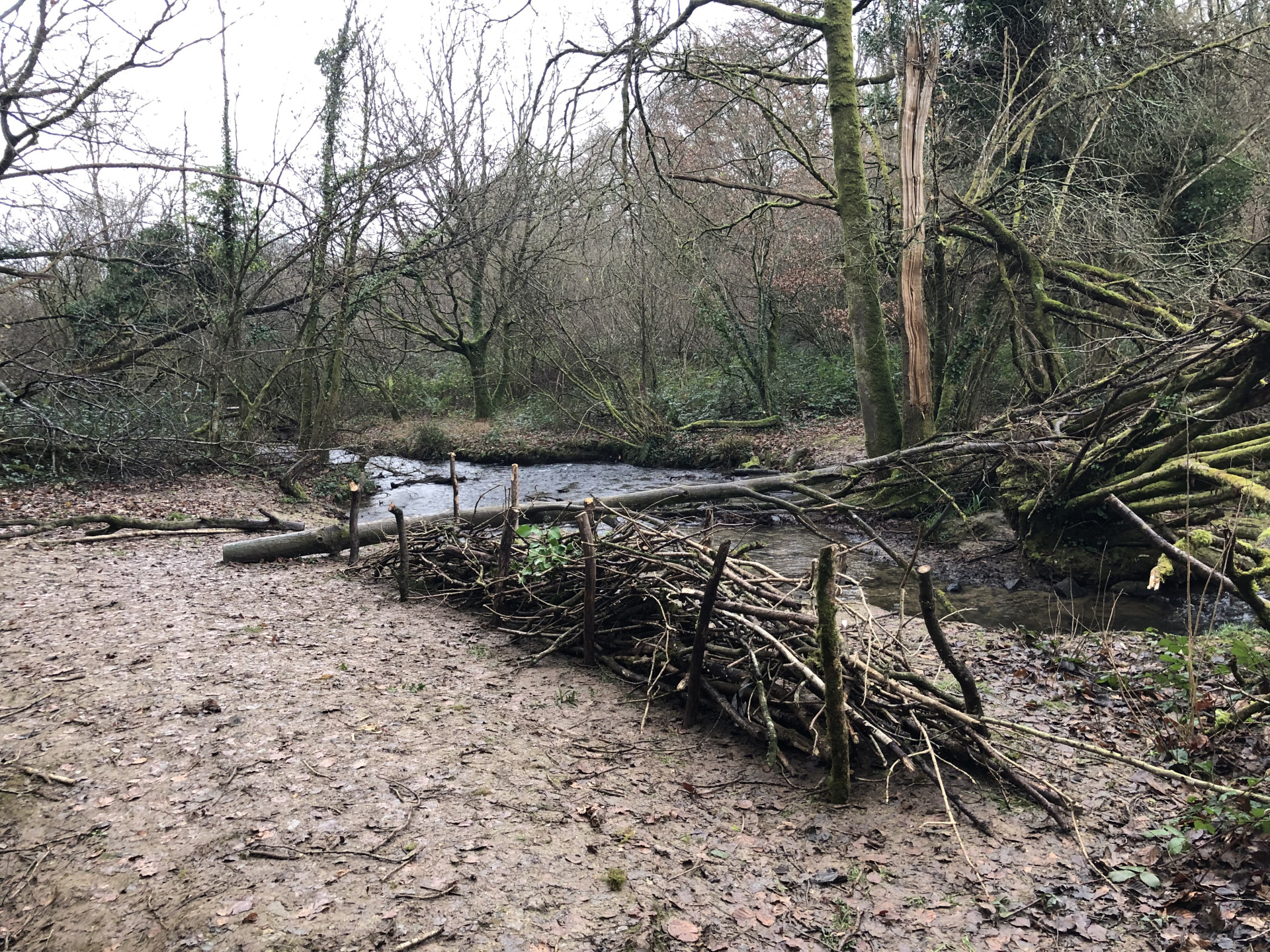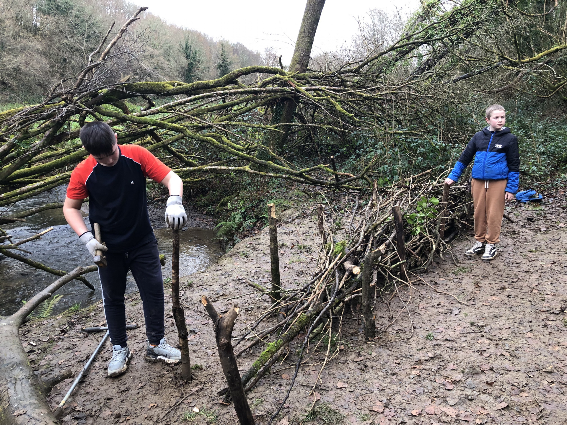 Avec Maëla Péron de l’EPAGA, une expérience a été tentée : installer deux haies sèches pour limiter l’écoulement de la boue dans la rivière, procurer un abri pour de multiples espèces animales et créer une zone de non-piétinement. Les élèves ont donc utilisé les branchages trouvés au sol autour de la berge, quelques outils et beaucoup d’énergie…et en deux heures, deux belles haies sèches avaient fait leur apparition :-)