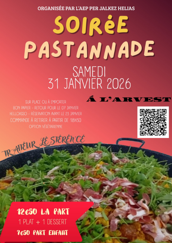 Afin de soutenir financièrement les projets éducatifs (sorties scolaires, classes de découvertes, spectacles,…) de l’école et du collège publics de Pleyben. L’association des Amis des Écoles Publiques (AEP) organise une soirée Pastannade sur RESERVATION UNIQUEMENT.