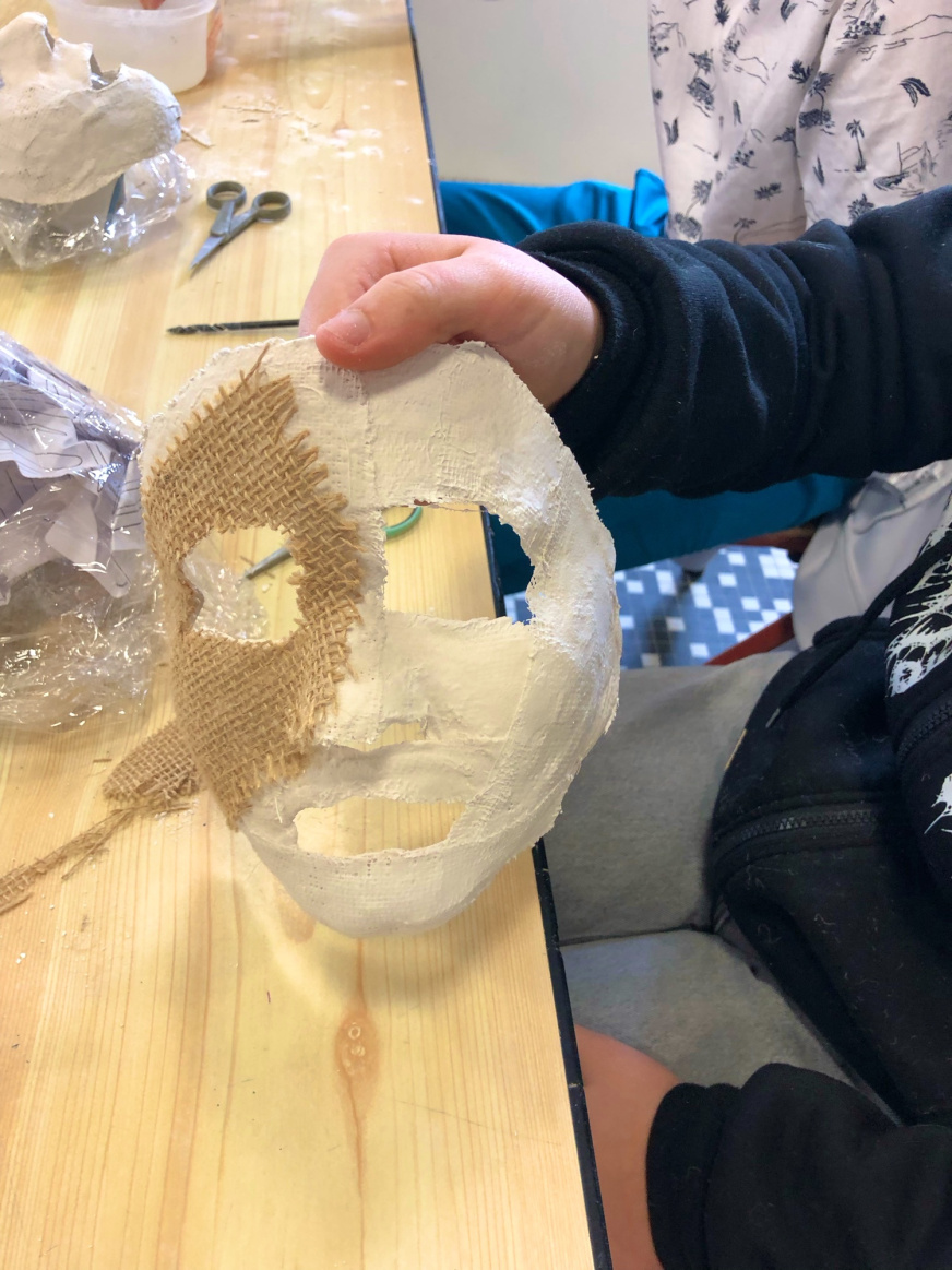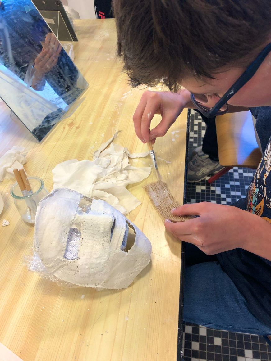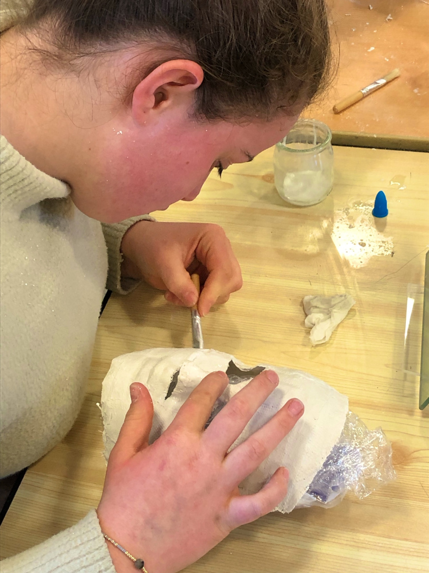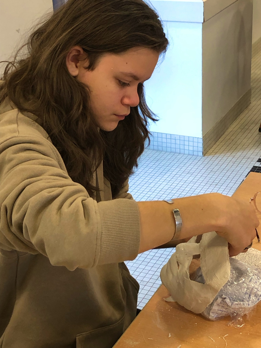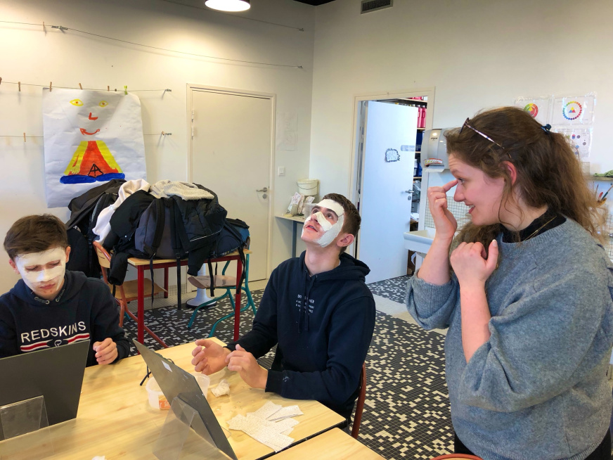 Pour les 3e3, l’aventure continue puisque Noémie Géron, une artiste qui accompagne Tro Heol, est intervenue au collège début janvier pour initier les élèves à la création de masques. Ils ont réalisé le moulage en plâtre de leur propre visage lors d’un atelier de 2h en demi-classe. Après un premier temps d’étonnement, la concentration et le soin ont pris leur place et les magnifiques productions parlent d’elles-mêmes.