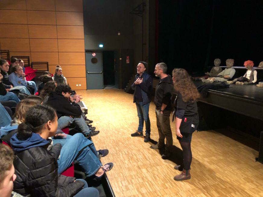 En complément de la représentation, l’équipe de Très Tôt Théâtre, à travers sa médiatrice Laura Mortreux, a permis aux jeunes d’échanger avec les metteurs en scène et comédiens de la troupe de Tro Heol, basée à Quéménéven.